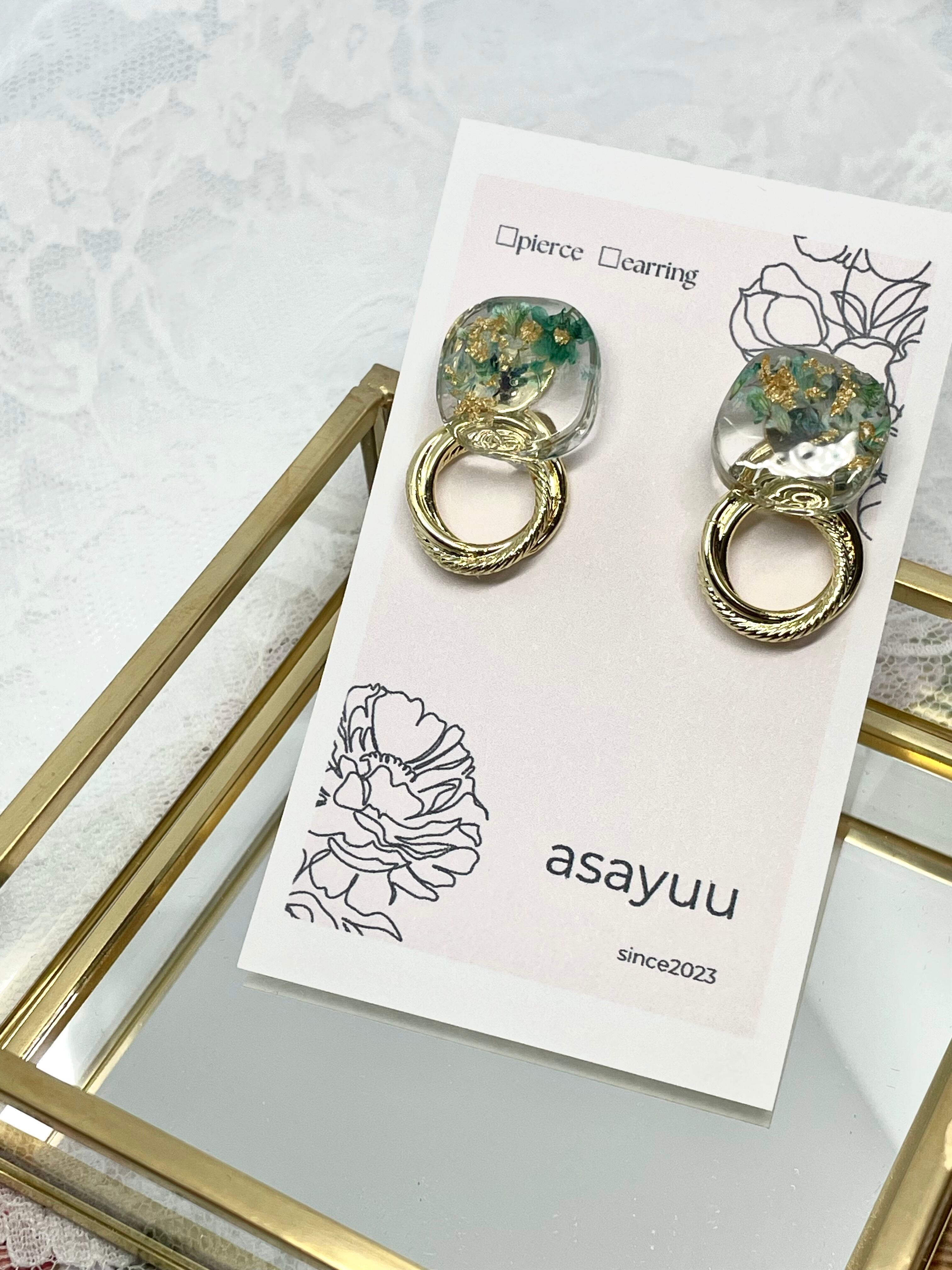 緑のドライフラワーとゴールドの箔が透明なレジンによく生えて顔周りを明るく見せてくれます。