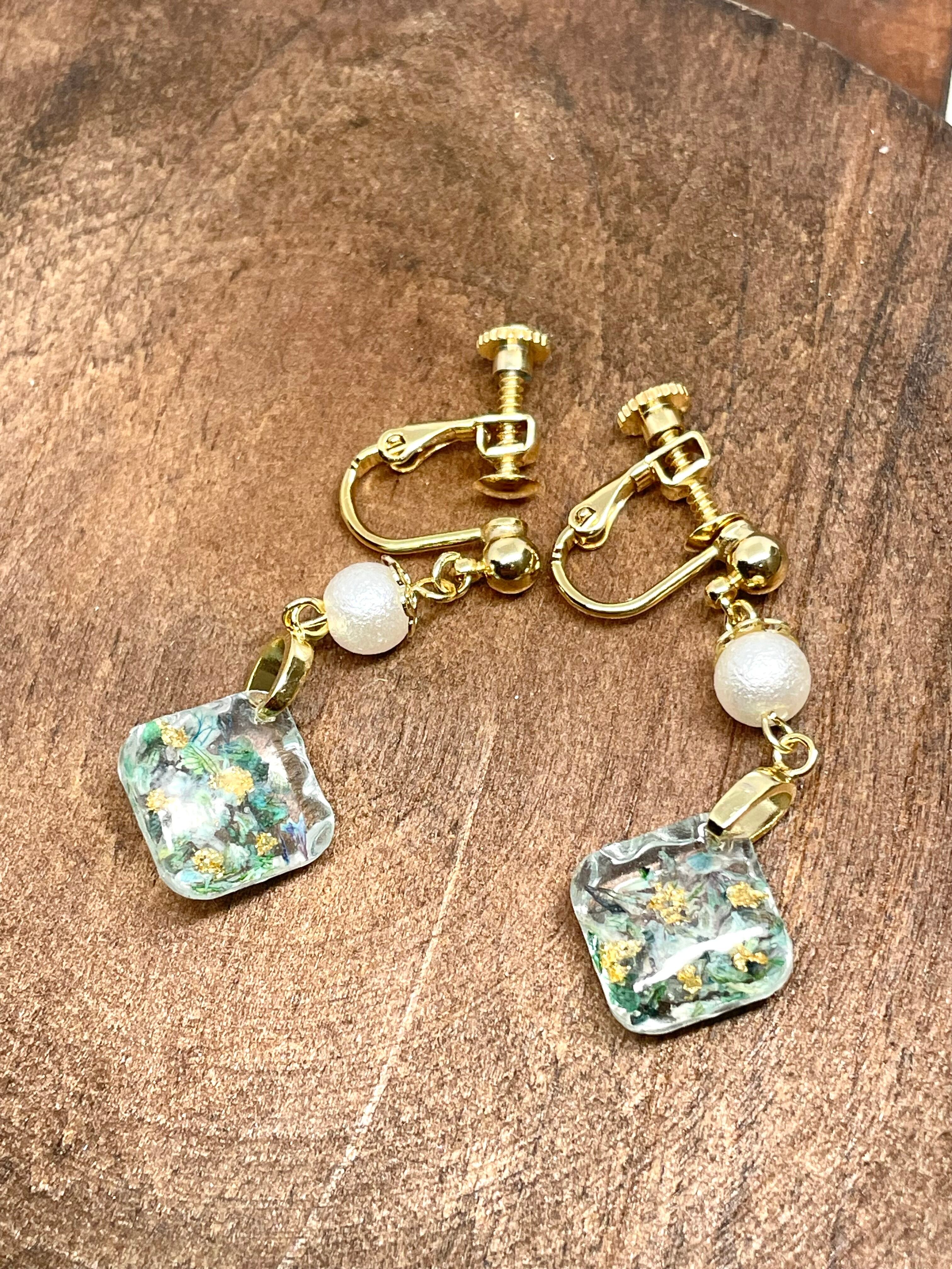 イヤリングの間に入っているコットンパールもよく見ると座金を挟んであり、可愛さをより際立たせてくれます。