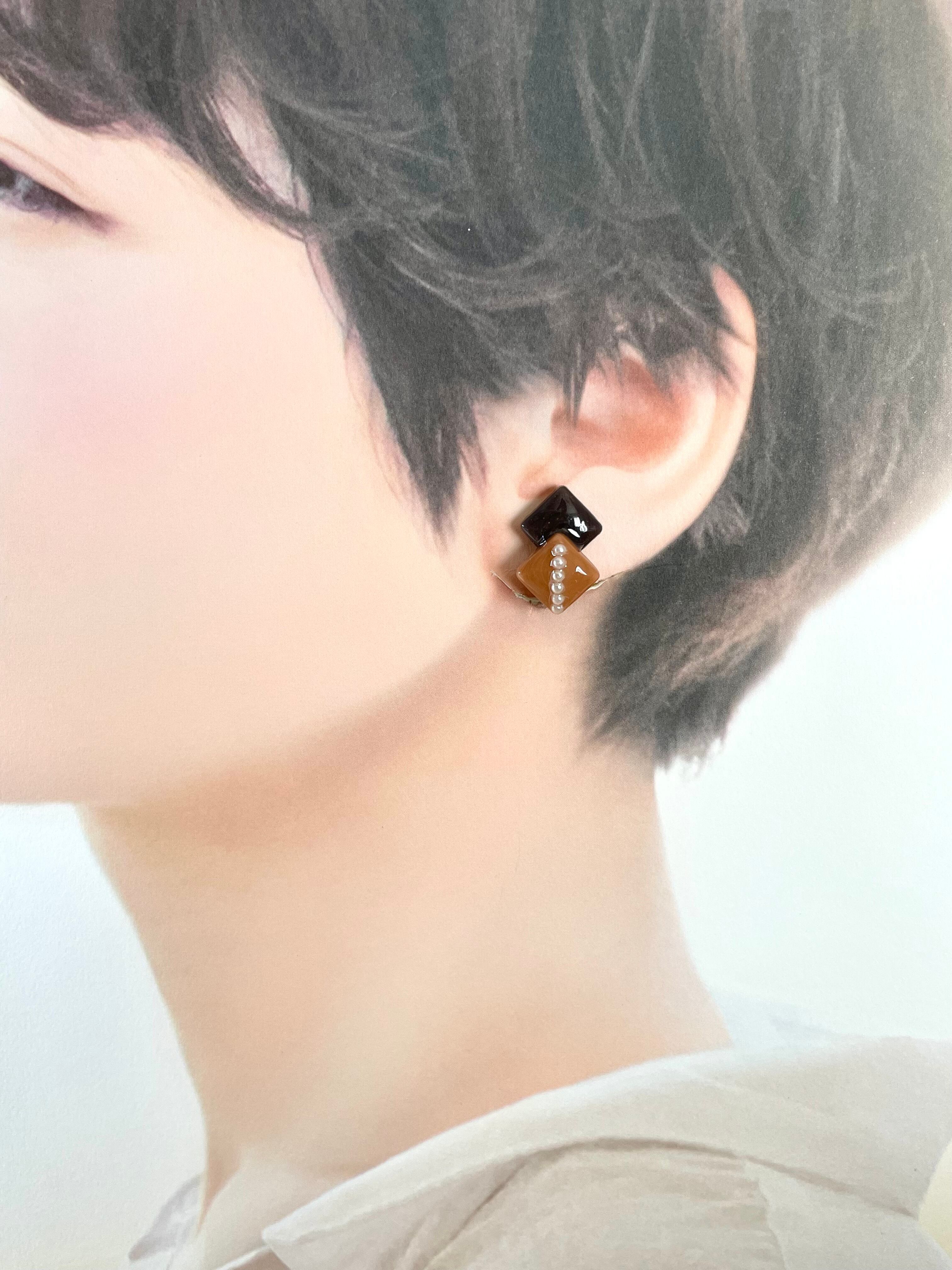 上品なキャメルとチョコカラーが美しいイヤリングのご紹介です。大人の女性にふさわしい、シンプルかつエレガントなデザインが特徴です。