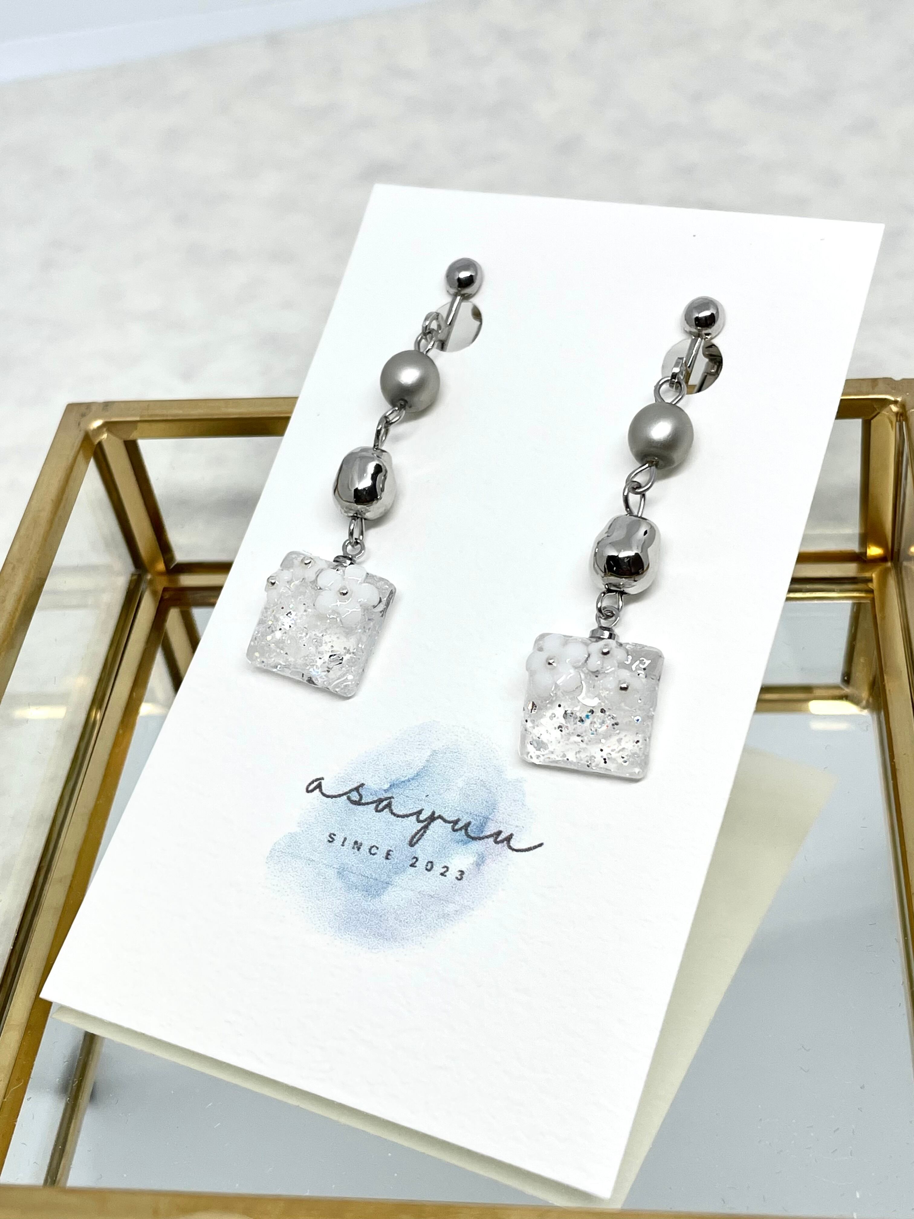 白のお花とラメのレジンが美しい作品。色味はシンプルでありながらも華やかさを持ち合わせたアクセサリーです。