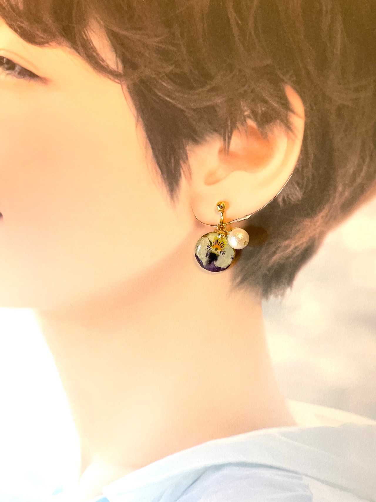 ビオラのドライフラワーが耳元を華やかにしてくれます。ビオラはアシンメトリーで、右側左側見る方向によって印象を変えてくれます。