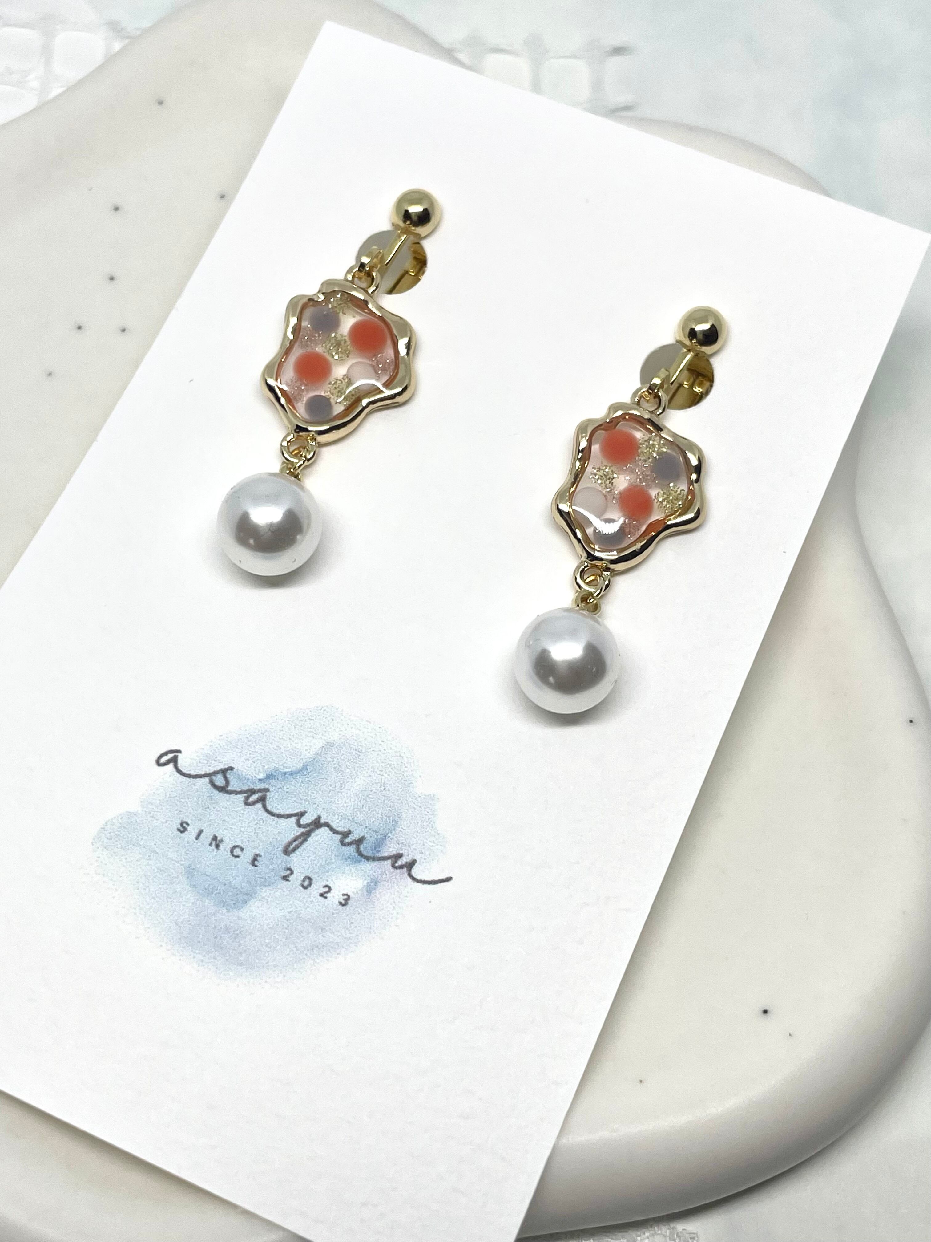オレンジとゴールドのスパンコールで出来たレジンは、明るく耳元を揺らしてくれます。